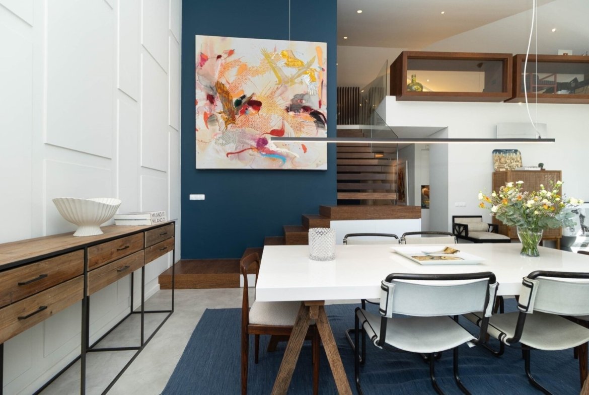 A striking wooden staircase, defined by bold architectural lines, gracefully connects to the duplex above.