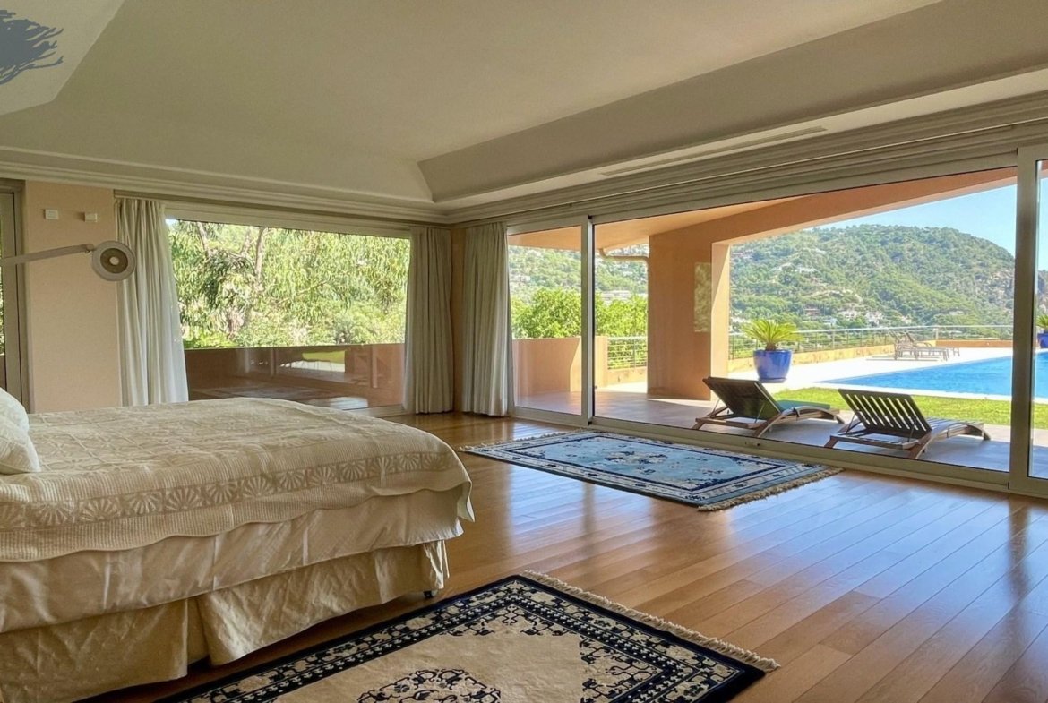 The primary suite, nearly 70 m², includes a fully fitted dressing room and a luxurious bathroom with Jacuzzi tub, walk-in shower, and dual independent toilets. A large picture window frames sea views and provides direct access to the poolside terrace.