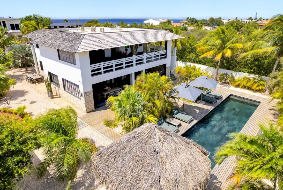 The villa, consisting of two floors, offers plenty of space and relaxation options. With 4 spacious bedrooms and 4 bathrooms, there is room for family and friends. The villa is distinguished by the different and spacious outdoor areas. The swimming pool, with wooden decks and a gazebo, is surrounded by an oasis of greenery and palm trees. Due to the very spacious plot, the garden provides maximum privacy and shade. The outdoor kitchen with teppanyaki grill and bar is the setting for creating unforgettable memories. The villa is located near and with a sea view in the beautiful street of Punt Vierkant. The plot offers the possibility to build an additional home.