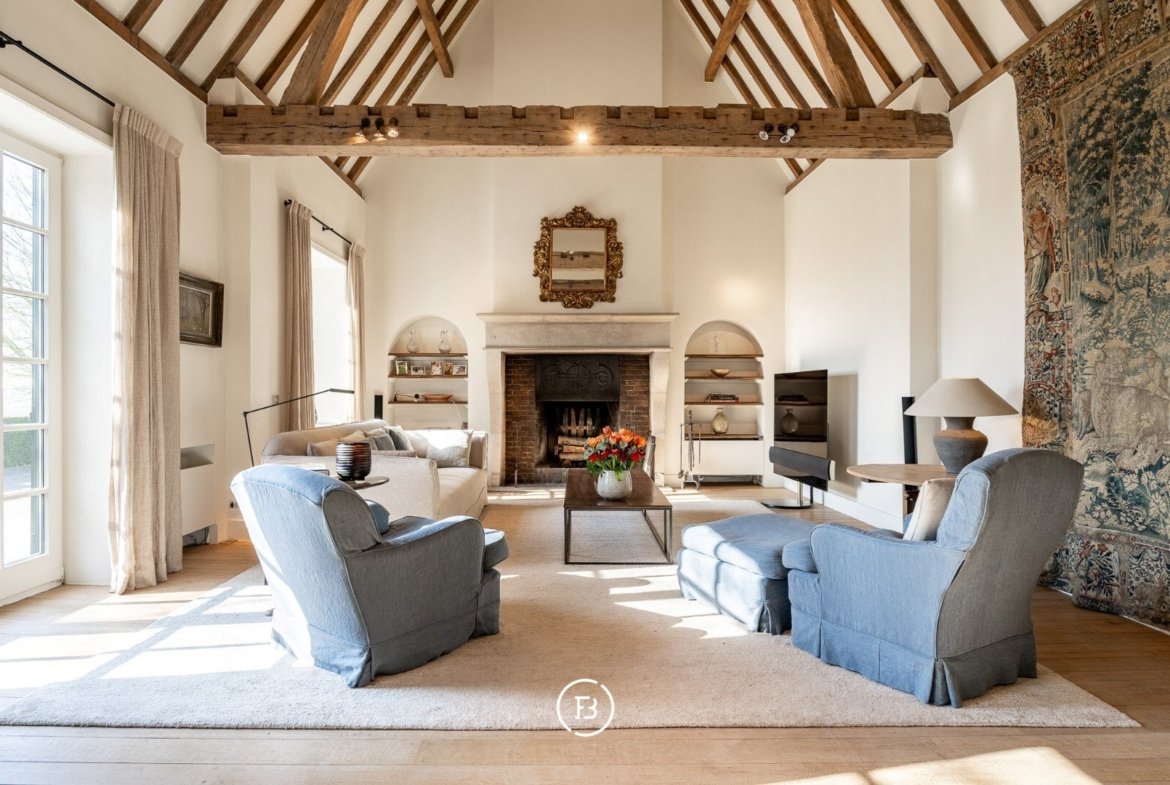 At the heart of the home is the spacious living room, featuring a cozy sitting area and an open fireplace. The high ceilings, accentuated by wooden beams, create a warm and inviting atmosphere. The living room seamlessly connects to the office space and the fully equipped kitchen, which was renovated in 2018 to include state-of-the-art appliances. A second living area, designed by Axel Vervoordt, offers an elegant additional dining space and a sitting area with another open fireplace.