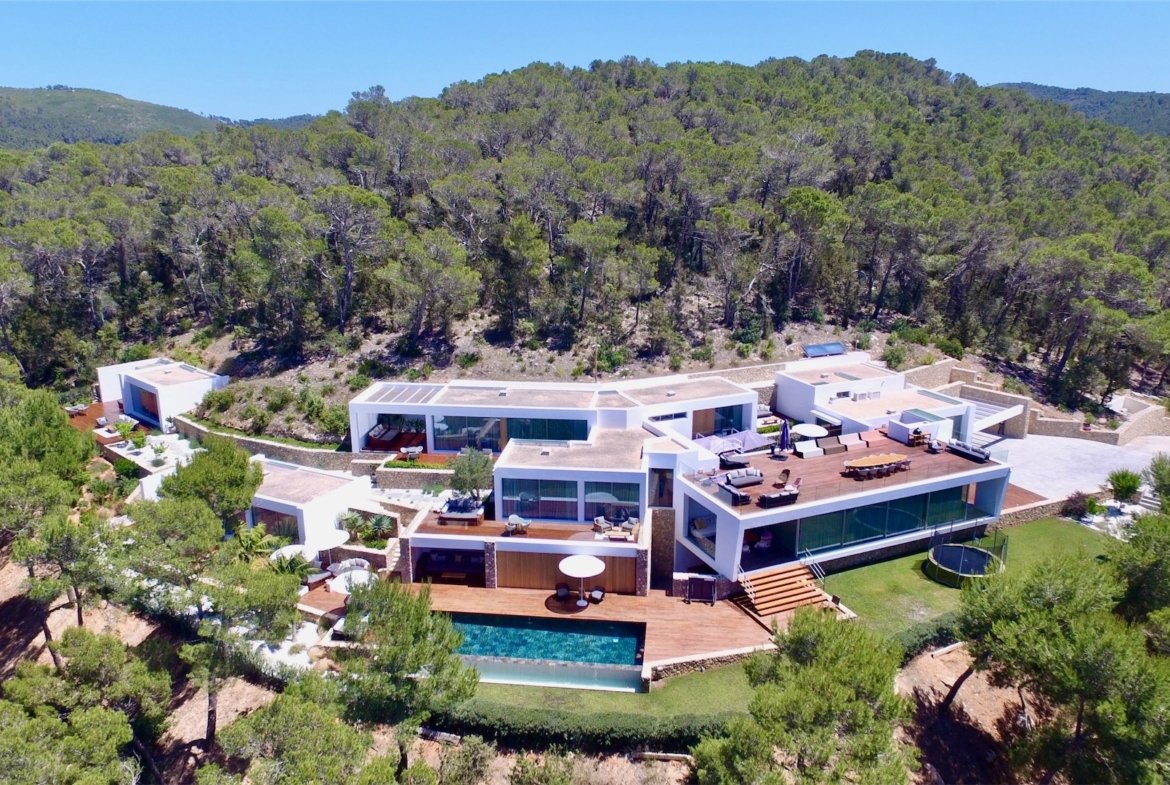 This contemporary villa features six bedrooms and was designed by renowned Argentinian-born, Ibiza-residing architect, Abraham Ariel. A house he considers to be his masterpiece, it combines bold cubist and modern architecture with bespoke carpentry throughout and a fluid interior decorated by leading interior designers from London and Bali to create a warm and soulful home. The sympathetic landscaping includes many indigenous plants and there is a beautiful lawn area from which to enjoy the views as well as an infinity pool, pool-side gym with Technogym equipment and a stylish bar and club space with professional sound system and points for DJ- decks.