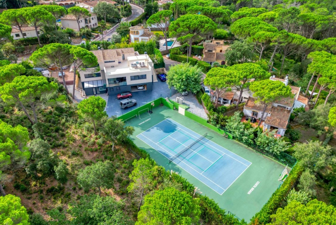 In the prestigious residential area of Santa Cristina d’Aro, surrounded by an incomparable natural setting, lies this impressive property that combines elegance, spaciousness, and exclusivity. The house, situated on a 1,643 m² plot, has a constructed area of 1,175 m² and offers panoramic mountain views.