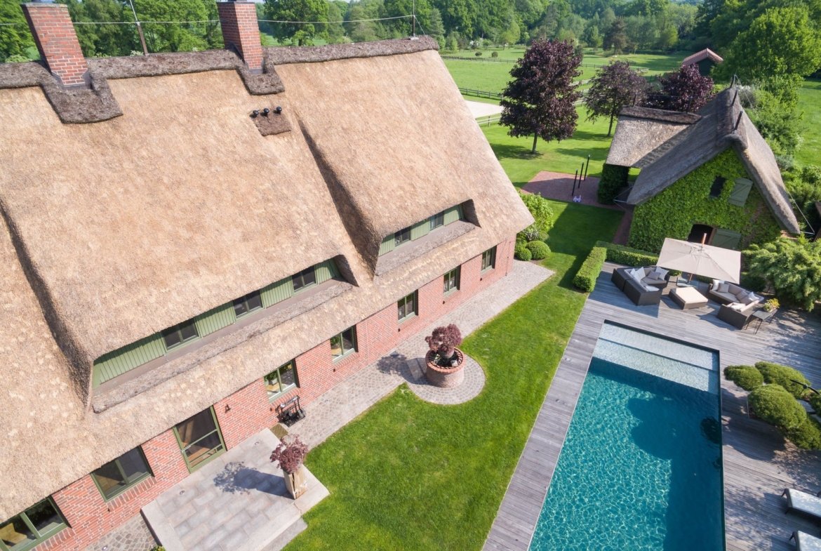 The connection to the region is evident in the reed-thatched roof and historic brickwork, crafted in the traditional style of centuries past. Enveloped by greenery and embraced by nature, this secluded estate is a private sanctuary. As you cross the emerald lawn, adorned with granite stepping stones, the stately doors invite you into a spacious and welcoming entryway.