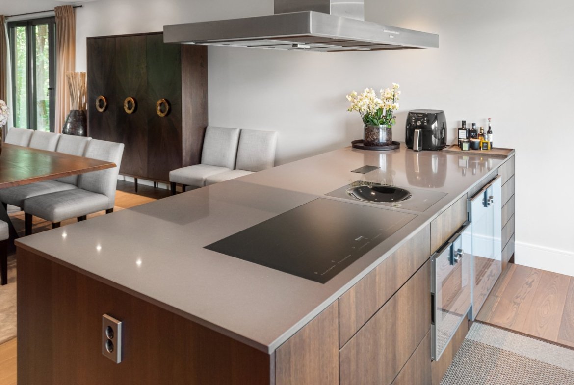 The state-of-the-art Kvänum-designed kitchen is a culinary masterpiece, equipped with top-of-the-line Gaggenau and Miele appliances. With Caesarstone countertops, a spacious kitchen island, and ample cabinetry, this kitchen is designed for both functionality and style. It seamlessly integrates with the living area, making it an ideal space for hosting gatherings.