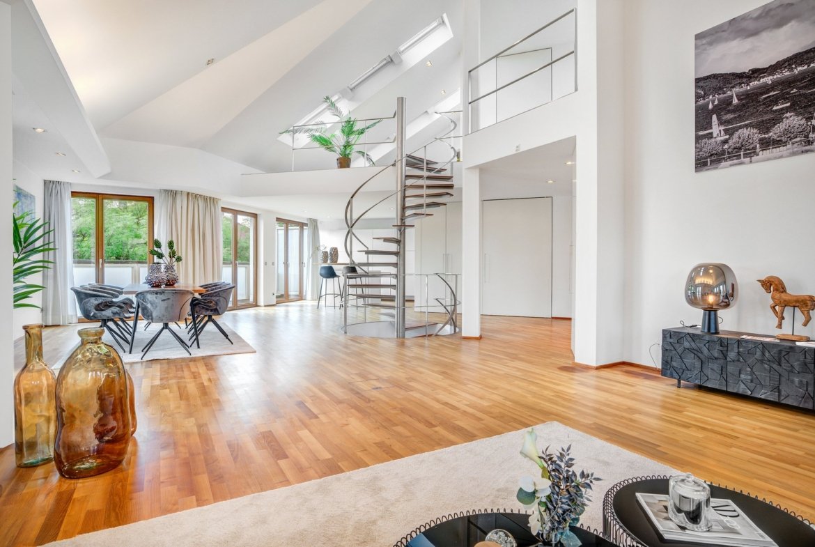 An elegant and open staircase in the living area leads to the gallery (6th floor) with access to the spacious roof terrace, which offers an unforgettable and unobstructed view over the rooftops of Maxvorstadt and the adjacent park.