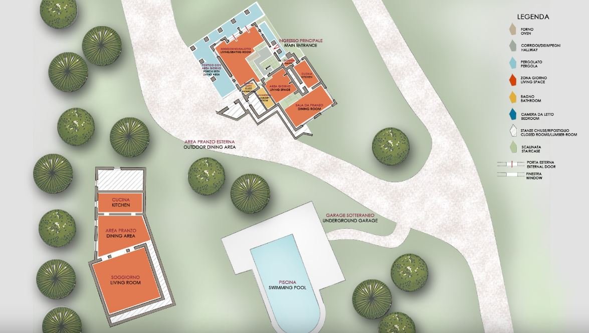 The main villa is laid out over two floors, both with external access, and is located adjacent to the entrance avenue.
