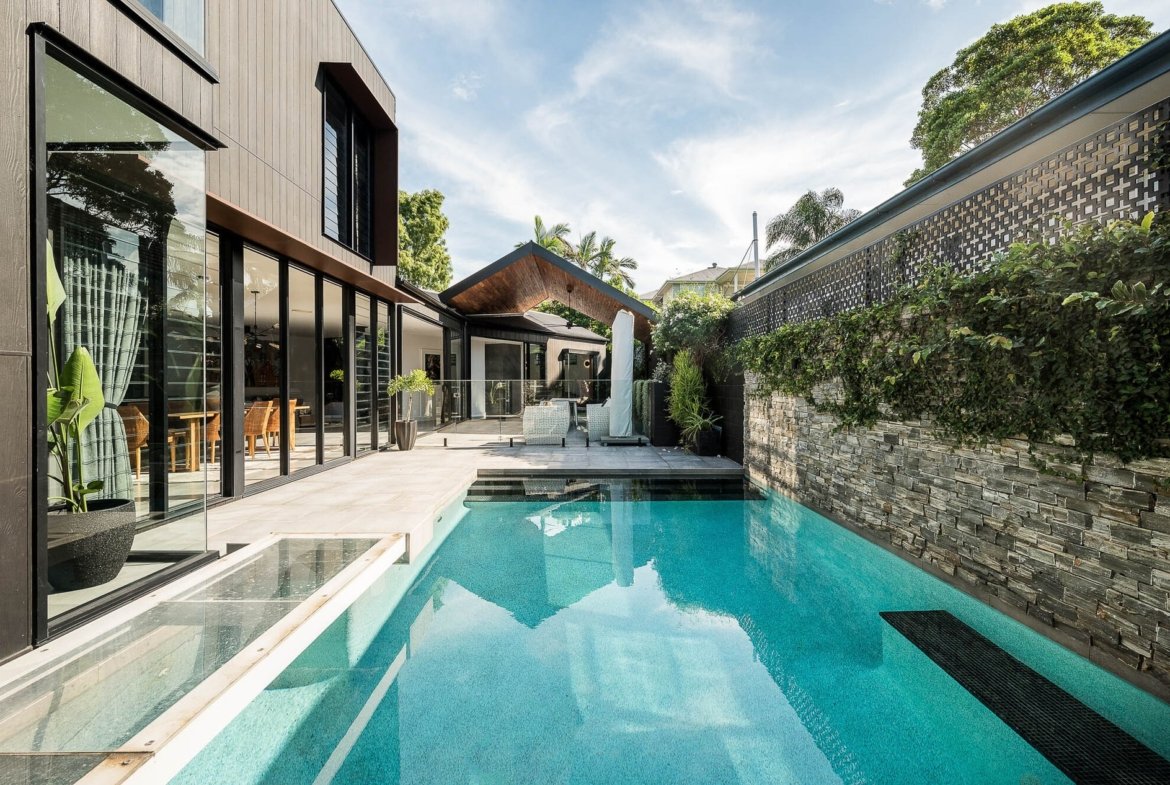 Private rear yard with alfresco entertaining pavilion and saltwater pool.