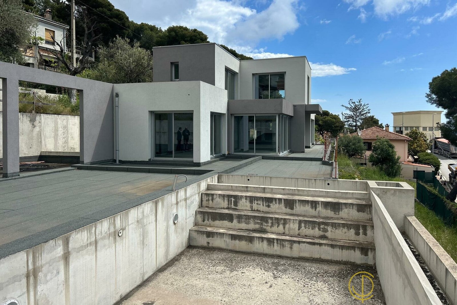 This modern villa, located just 5 minutes from the border of Monaco, will become an architectural gem when finished. Set over three levels, seamlessly connected by an internal lift, it offers unrivaled views of Monaco and the azure sea. Constructed entirely from reinforced concrete, the villa covers 643 square meters on a huge estate of over 1,600 square meters, adorned with terraced landscapes and extensive flat plots. Proekt design boasts meticulous craftsmanship and exquisite finishing.
