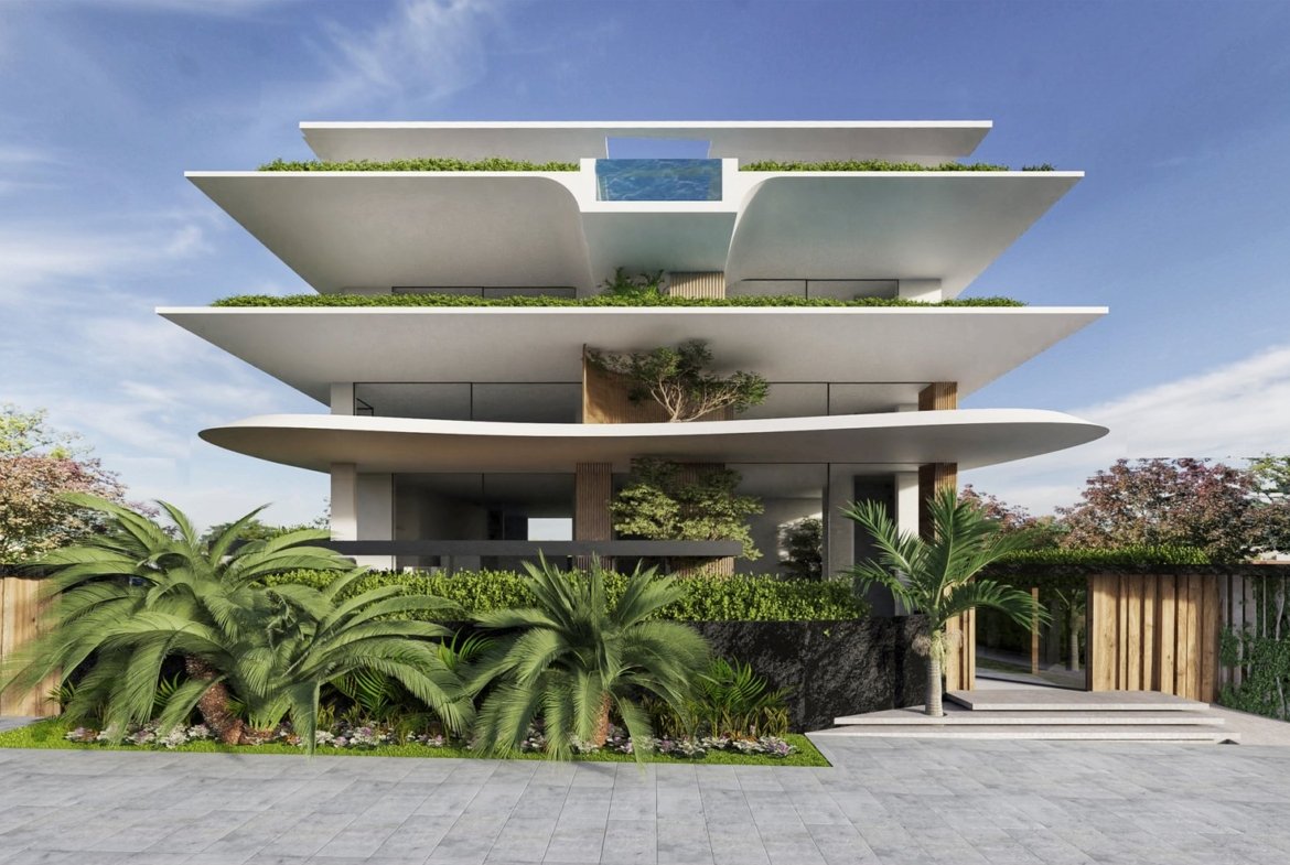 Architecturally, the design combines clean geometric lines with natural materials such as stone, wood, and glass, while cantilevered balconies accentuate the building’s connection to the maritime landscape, creating a sense of flow and lightness that resonates with the ambiance of the area.