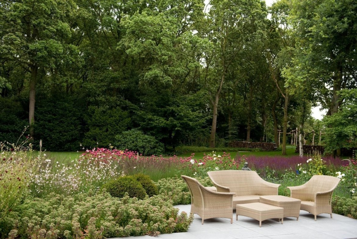 The beautiful and architecturally landscaped garden has a forest, several beautiful flower beds and terraces, a pergola, a pond and a heated pool.