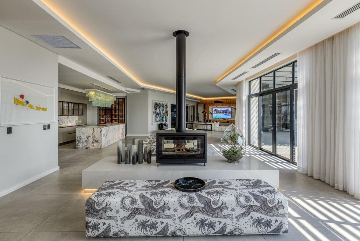 Designed for effortless entertaining and ultimate relaxation, the home features both formal and informal lounge and dining areas, as well as inside and outside bars perfect for hosting guests or enjoying quiet evenings in style. Stephen Pikus chandeliers and original artworks by Ramrutha Makoba add bespoke artistic flair, elevating the space with character and elegance.
