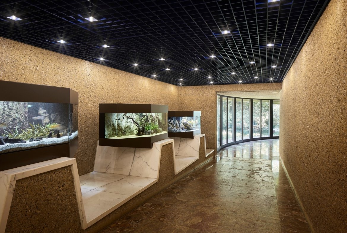 The common parts boast aquariums and fountains while a lush garden gives notes of green and peace to the entire structure.