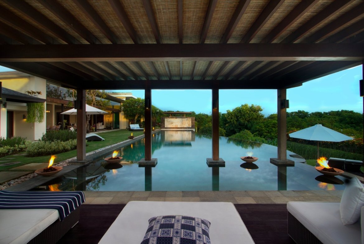 Architecturally, the estate is a perfect harmony of contemporary luxury and traditional Balinese craftsmanship. The open-air living room offers uninterrupted views of the horizon, while the gourmet kitchen and dining area are ideal for both intimate gatherings and lavish entertaining. Additional amenities include a media room, a study, and a rooftop deck above the master suite that offers 180-degree ocean views.